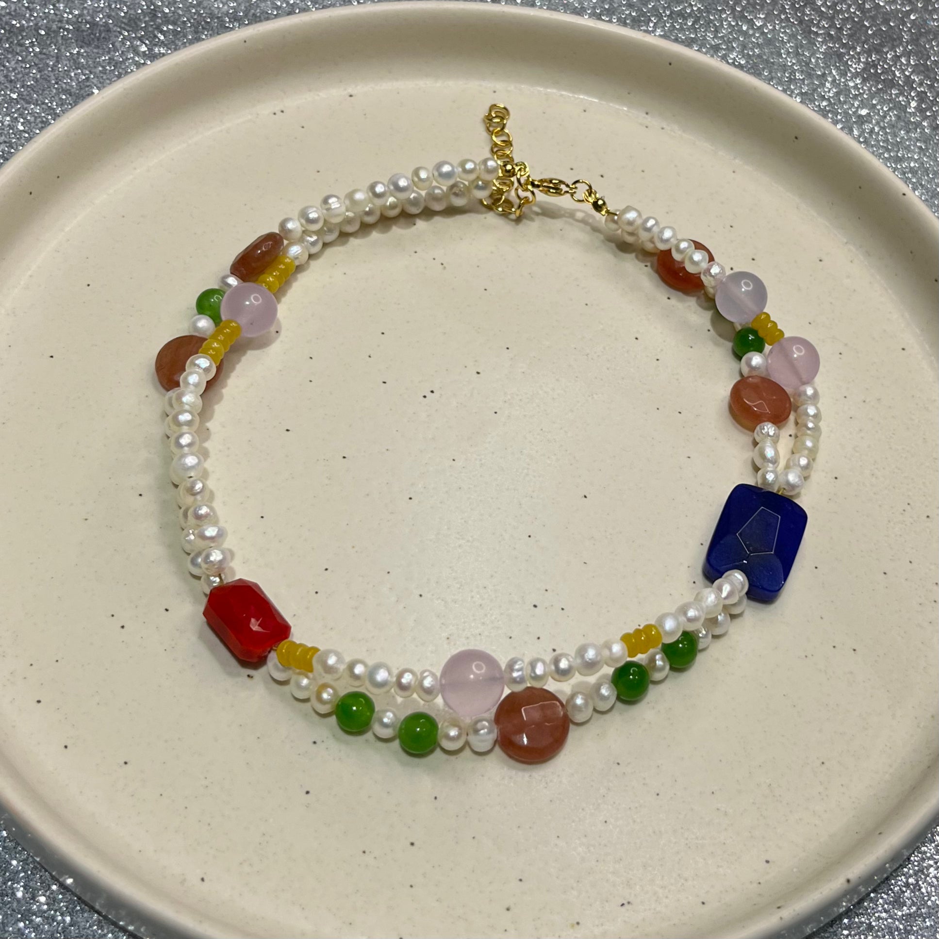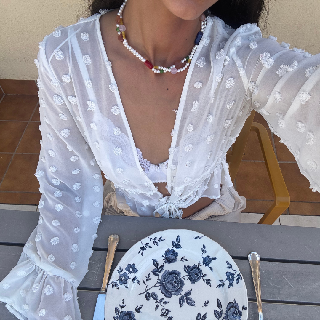 Cada perla cuenta su propia historia con formas orgánicas e imperfectas, mientras que los toques de color aportan frescura y alegría. Ideal para elevar desde un look casual hasta un outfit más sofisticado, este collar artesanal se convierte en el detalle estrella de cualquier conjunto.