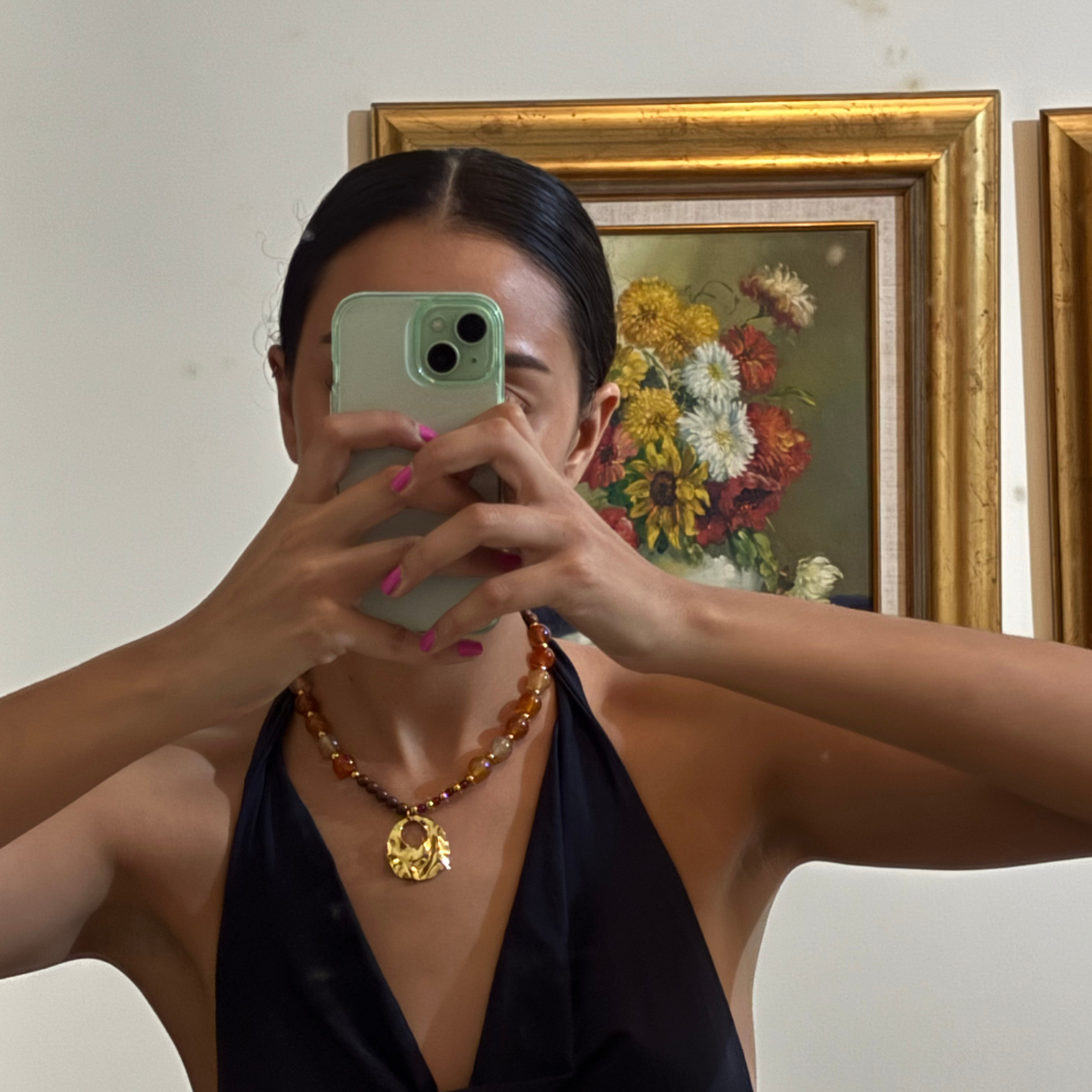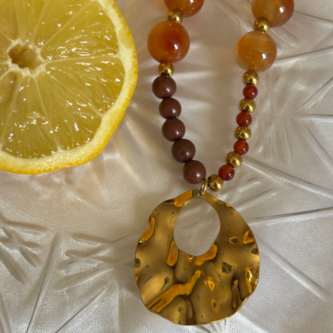 Esta pieza única combina la calidez de los tonos marrones y dorados, creando una joya moderna, versátil y con una presencia inolvidable. Este collar no solo es una declaración de estilo, sino también de autenticidad y buen gusto.