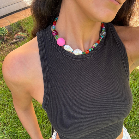 Cada collar que creamos está pensado para mujeres auténticas, creativas y con una conexión personal con lo que llevan puesto. Combinamos materiales naturales como las perlas de río, colores vibrantes, y formas contemporáneas para dar vida a piezas que celebran la belleza de lo imperfecto, lo único y lo hecho con alma.
